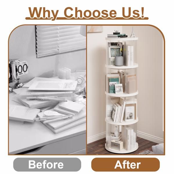 [Stylish and Modern Aesthetics] Plastic rotating bookshelves often come in sleek, modern designs that can add a stylish touch to any room's décor.And all necessary hardware & tools included and all labeled parts, easy to assemble. No matter before or after-sales